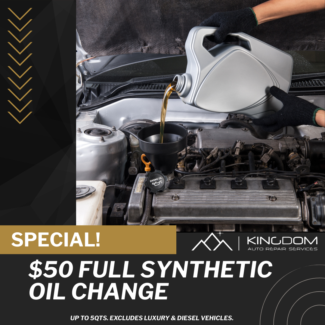 Excludes Luxury & Diesel Vehicles. Up to 5 Qts of Full Synthetic Oil and One Filter. Call store for details.